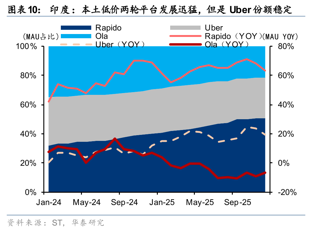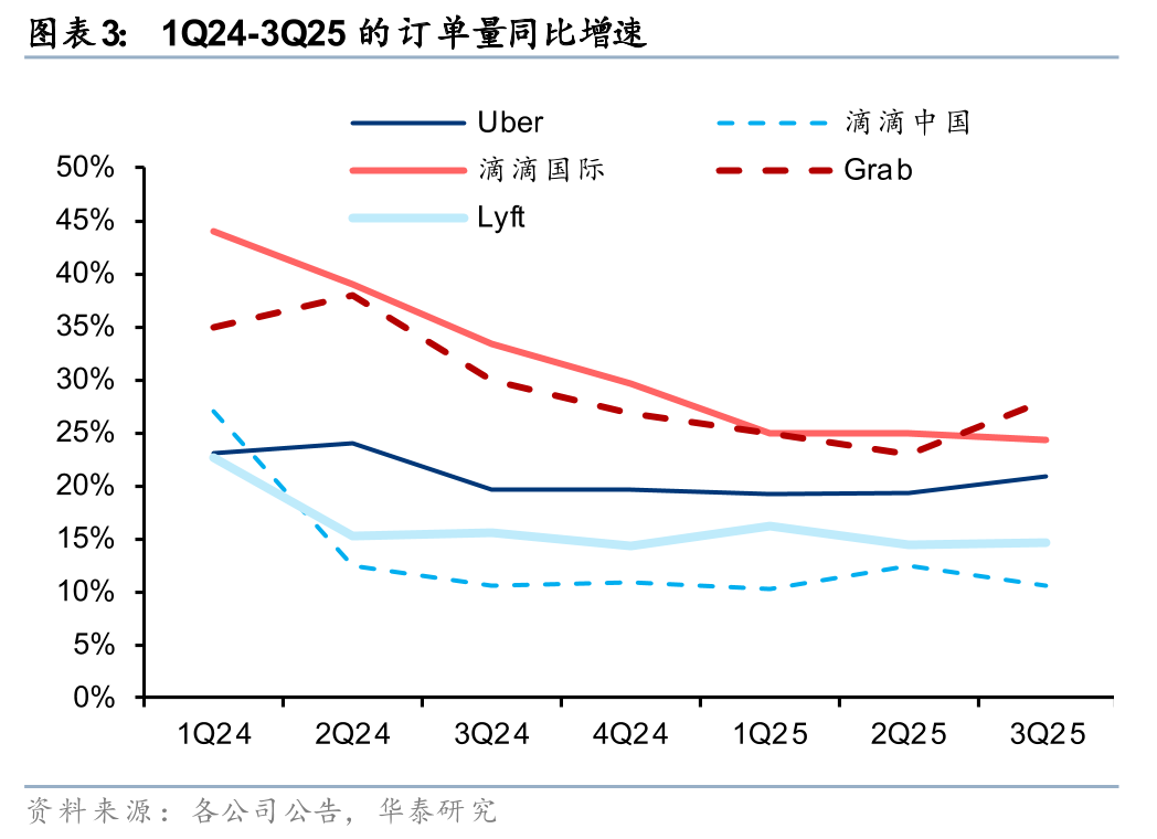 区域增长潜力决定平台GTV增速中枢,目前来看拉美/EMEA/印度>东南亚>美国>中国大陆。3Q25GTV同比增速层面,滴滴国际>Uber>Grab>Lyft>滴滴中国。滴滴国际业务1Q25-3Q25的同比增长环比加速,除拉美出行发展迅速之外,在巴西新布局的外卖业务有部分贡献。Uber在GTV高基数下仍然增长领先,一方面是全球化布局可以获取新兴市场渗透增量(拉美、EMEA、印度等),一方面是价格带下沉拓宽客群(主要发生在美国本土)。Grab\Lyft\滴滴中国的GTV增速中枢排序,我们认为这也代表了东南亚、美国本土、中国大陆的区域增长潜力排序。