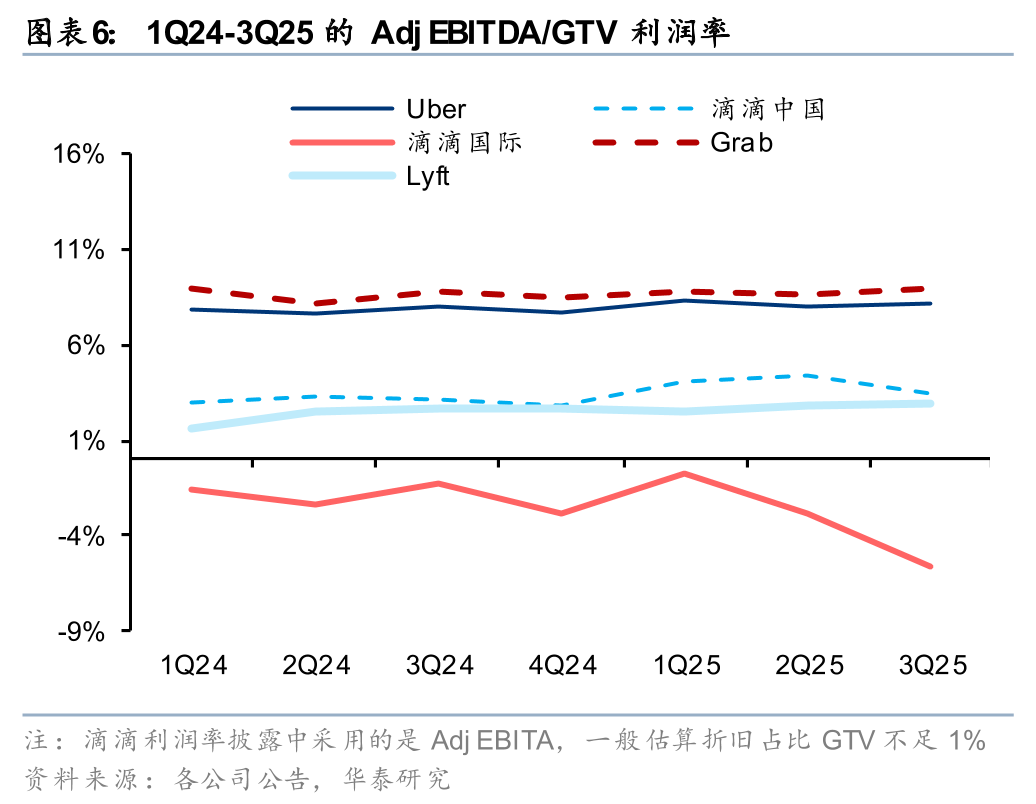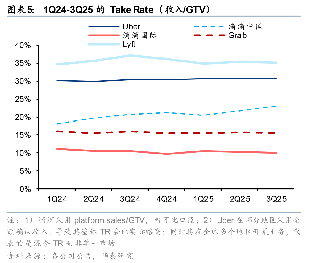 TR在平台间差异显著,滴滴TR稳步提升,其他平台表现稳定。3Q25TR在平台间差异显著,Lyft(35%)>Uber(31%)>滴滴中国(23%)>Grab(16%)>滴滴国际(10%)。我们判断原因为:1、经济水平和当地政策,抽佣率从经济发达地区到发展中地区逐渐降低,另外政策规定(比如我国对于网约车平台抽佣率有限制)等也有影响;2、抽佣交通工具种类差别,中美出行平台主要是针对四轮车抽佣,而东南亚、拉美的出行交通工具存在大量两轮车,导致抽佣较低;3、收入确认口径,比如Uber在部分地区采用全额确认收入(收入=GTV),导致其整体TR会比实际略高。当前能看到滴滴的TR在稳步提升,其他平台均表现稳定。