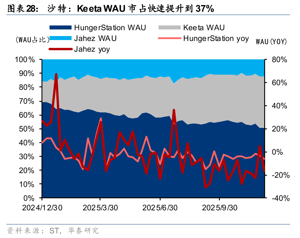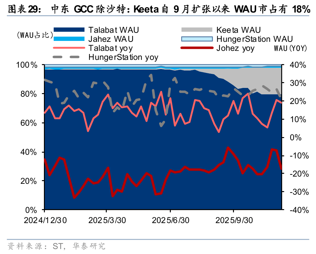 3、区域出现明确的竞争威胁,GTV为负。美团3Q在国内经历激烈的补贴竞争,GTV增速转负,Jahez则是沙特地区受到Keeta快速扩张的激烈竞争,同样GTV同比增速转负(作为对比,在非沙特地区运营的talabat则未受影响)。