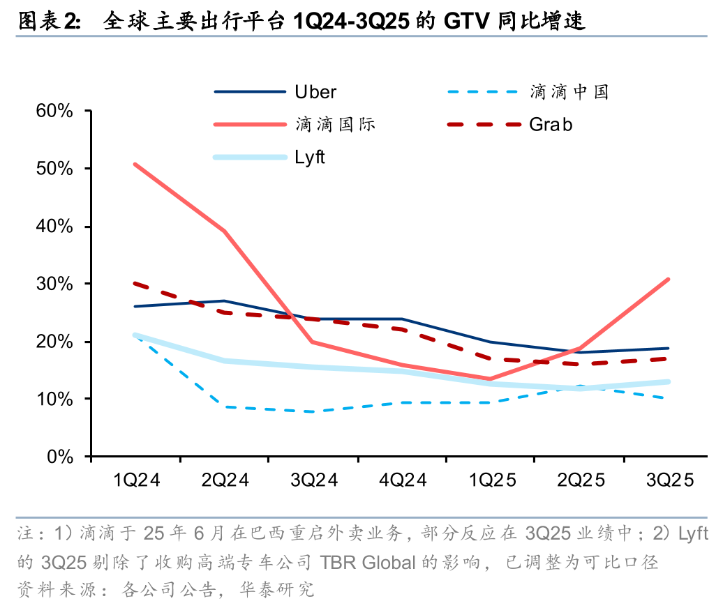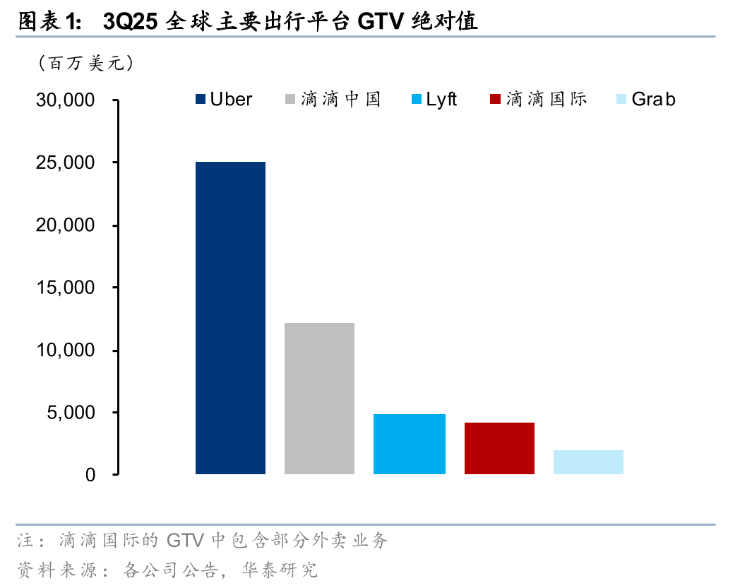 全球出行平台GTV(Gross Transaction Value)中Uber最大,美国市场份额达到70%,并且是全球多区域龙头;滴滴3Q25合计GTV是Uber的65%,中美两国出行GTV相近、滴滴和Uber的市占率也相近(约70%),差别主要是Uber国际业务体量更大,滴滴国际业务则主要在拉美和Uber竞争;Lyft主要是美国第二大平台,市占率约30%,尝试布局欧美其他市场但是体量较小;Grab是东南亚最大平台,发展迅速但是整体受限于市场体量,集中在东南亚六国深耕。