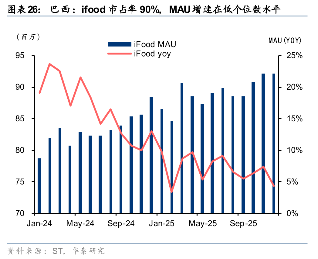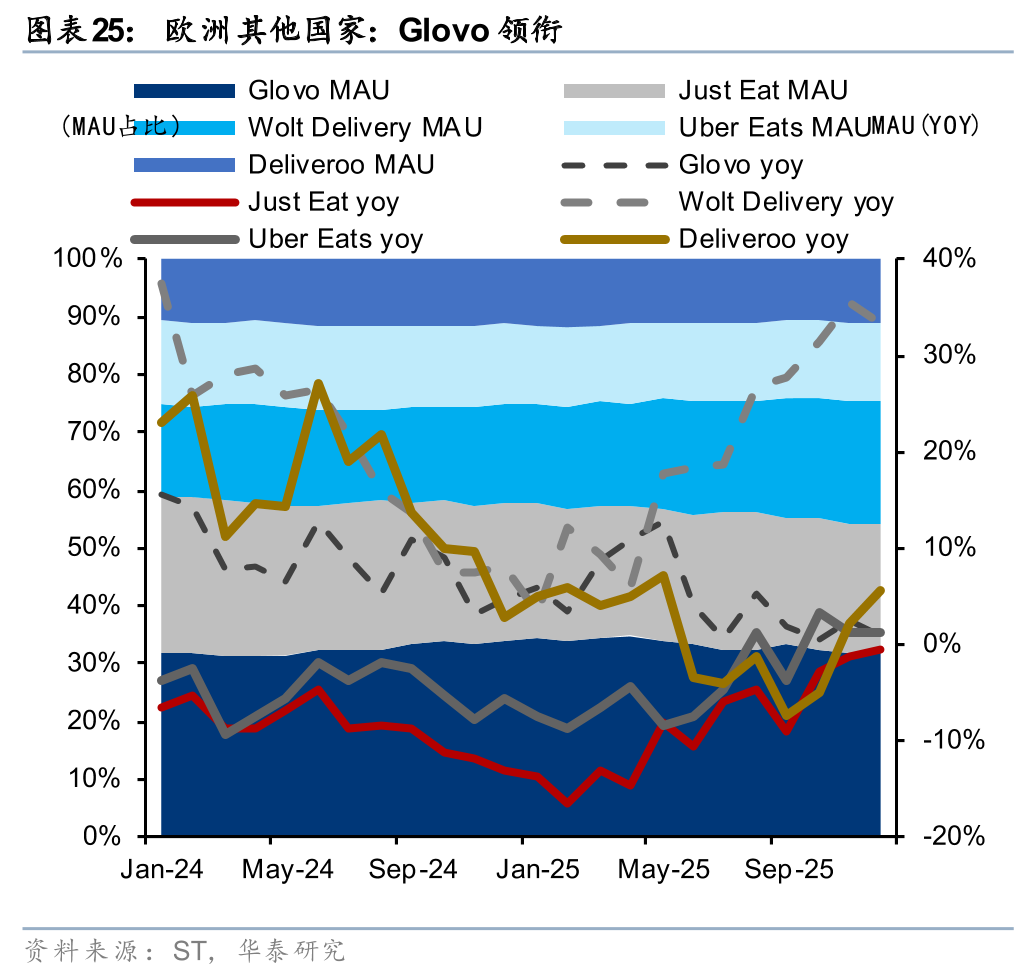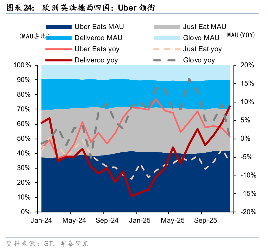 全球外卖市场多项收购整合,形成四大全球性外卖平台。1、美团,中国外卖龙头,24年以Keeta品牌进军中东,25年进军巴西。2、Dash,美国外卖龙头,20年收购欧洲外卖平台Wolt,25年收购欧洲外卖平台Deliveroo。3、Uber,美国外卖第二寡头,欧洲核心国家外卖龙头,全球布局,25年收购土耳其外卖平台Trendyol GO。4、Prosus,旗下全资持股巴西外卖龙头Ifood;持股30%外卖平台Delivery Hero(旗下包括Foodpanda、Glovo、talabat(持股85%)、Hungerstation);持股印度外卖平台Swiggy的25%股权;25年43亿美元收购欧洲外卖平台Just Eat。