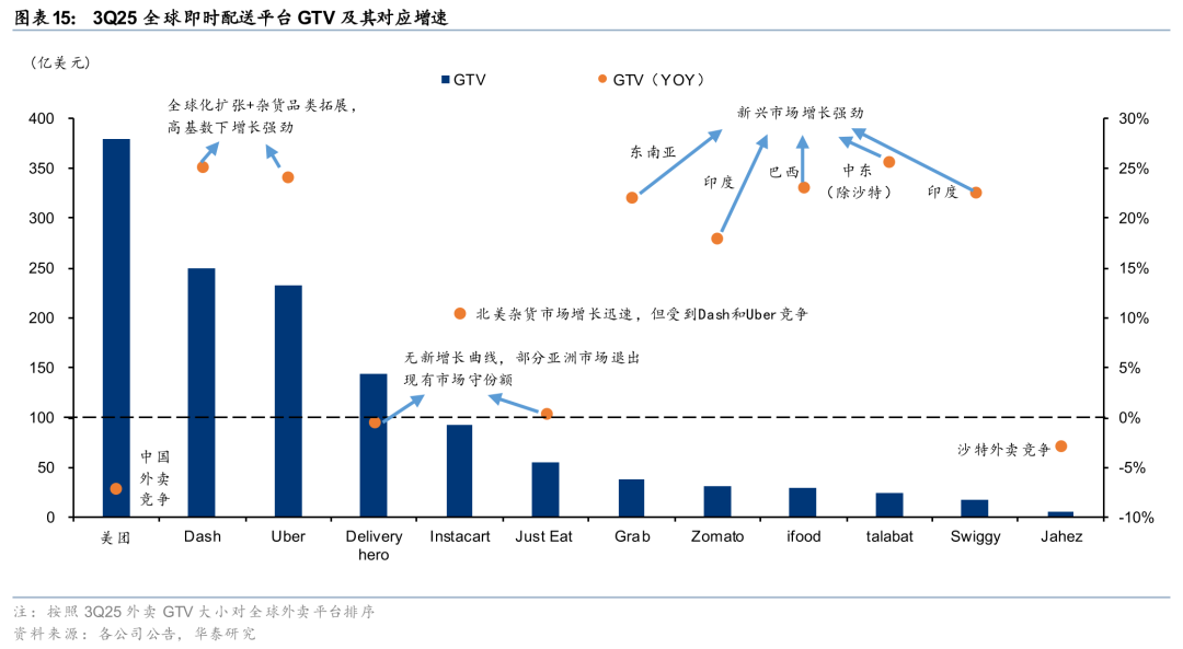 全球化、新兴市场和非餐配送是主要增长点,因多地区竞争激烈,部分区域龙头3Q25GTV增长转负。3Q25GTV同比增长如下: