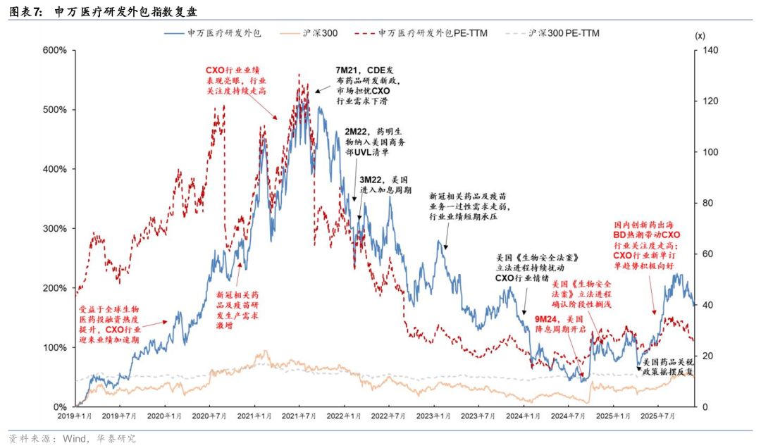3)9M24至今(新一轮CXO行情重启):得益于外部扰动因素的整体改善,CXO板块估值整体重回升势,但期间受部分事件冲击出现短期回调;其中,具有标志性意义的事件包括:a)2024年9月,美联储宣布降息50bp,全球生物医药投融资复苏预期在降息周期开启后逐渐提升;b)2024年12月,美国《生物安全法案》立法进程确认阶段性搁浅;c)2025年7月,美国《生物安全法案》立法进程重启;d)2025年8月,美国总统特朗普暗示征收药品关税;e)进入2025年后,国内创新药BD出海热潮持续,带动CXO企业新签订单整体呈现积极改善态势。考虑美联储降息预期延续、国内行业需求边际复苏、叠加产业升级趋势确立,我们看好CXO板块后续有望迎来业绩与估值的戴维斯双击。