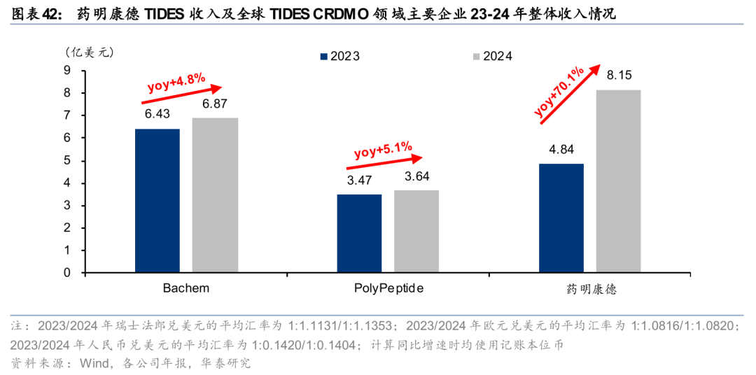 国产多肽服务商已跻身全球龙头地位。目前全球多肽CRDMO供应商主要包括Bachem、Polypeptide、Ambio、药明康德、凯莱英、泰德医药等,海外供应商中Bachem和Polypeptide相对领先,其23年全球份额分别为13.8%及10.0%。国产供应商中,药明康德24年TIDES板块(主要为多肽和寡核苷酸)整体收入已达8.15亿美元(规模超过Bachem的6.87亿美元、PolyPeptide的3.64亿美元,两者亦聚焦TIDES领域),已跻身全球多肽/TIDES CRDMO第一梯队;凯莱英及泰德医药等国产厂家亦加速追赶,如凯莱英1H25化学大分子(多肽、寡核苷酸等)收入3.79亿元,同比增长超130%;泰德医药1H25总收入2.54亿元,同比增长28.5%。