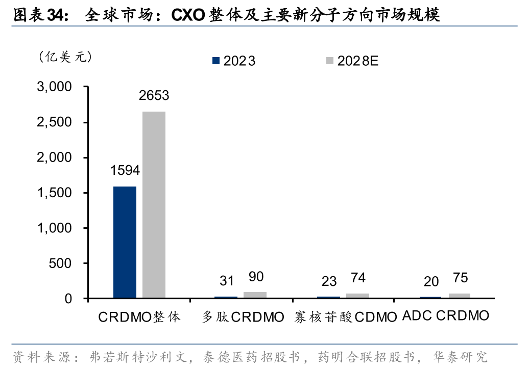 我们在报告中详细分析了新分子对于中国CXO行业的重要机遇。新分子药物技术壁垒更高且往往产能先行(早于订单),对于CXO公司的产能快速扩张能力、人员补充能力、传统小分子领域的开发生产能力(ADC)、及前端业务能力(产业趋势判断能力、卡位能力)等要求较高,这些要素与中国CXO的核心竞争力高度匹配,因此国内供应商竞争力有望保持甚至扩大。