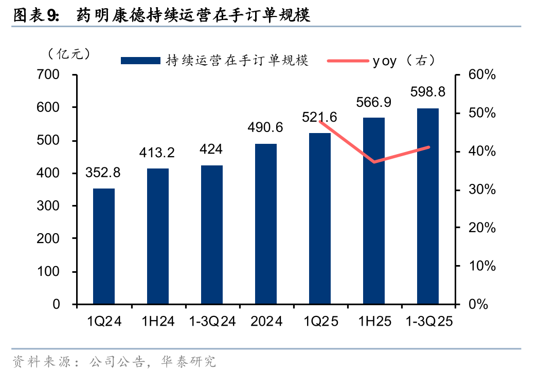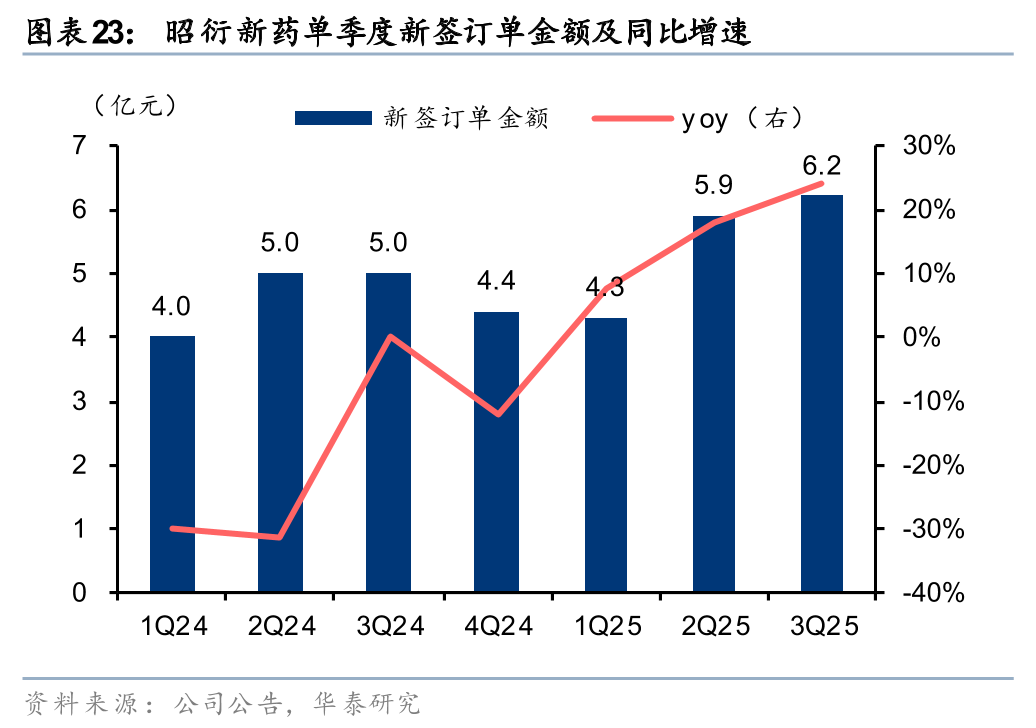 2)内需型CXO:虽然国内生物医药投融资强度整体仍待修复,但国内创新药出海BD自2023年起明显提速并在进入2025年后进一步走强。相关BD交易授权费部分填补了国内行业投融资缺口,且部分BD交易所包含的后续里程碑分成亦有望为行业持续带来增量资金。根据医药魔方和动脉橙的资料,仅1H25国内披露的创新药license out交易总金额即达598.36亿美元(yoy+153%),其中交易首付款26.28亿美元(yoy+203%),已超同期国内生物医药投融资规模(14亿美元)。得益于此,内需型CXO新签订单规模已呈现向好态势。以昭衍新药为例,公司1Q25-3Q25单季度新签订单金额同比持续提速。