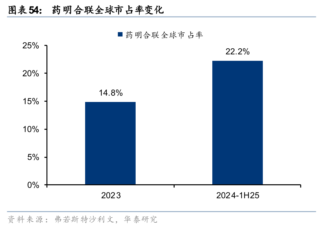 药明合联已实现全球领先,国产供应商技术布局有序扩张。全球ADC及更广泛生物偶联药物外包服务市场呈现相对集中的格局。根据弗若斯特沙利文的资料,药明合联22年全球市场份额为9.8%,位居全球第二(前五家合计份额达50%),且近年市场份额快速提升,市占率于2024-1H25已提升至22.2%(凭借优秀的战略及良好的交付记录)。中国市场格局亦相对集中,其中药明合联22年份额约69.5%,前三家合计份额约80%。国产供应商在ADC服务领域布局有序扩张,以药明合联为例,其是业内偶联技术储备较丰富的企业之一,通过自研以及对外合作,目前已拥有超过10种领先的偶联方案。其亦是全球唯一覆盖ADC研发、工艺开发、大规模生产的一站式CRDMO(截至6M23)。