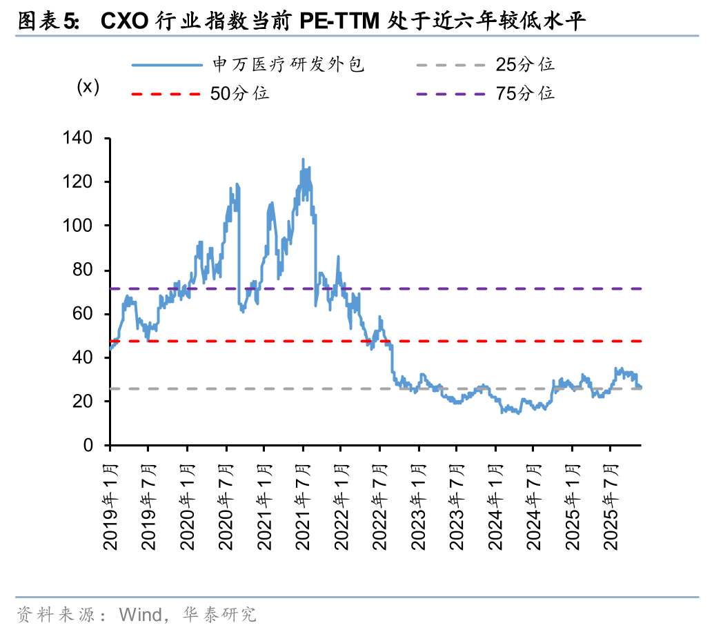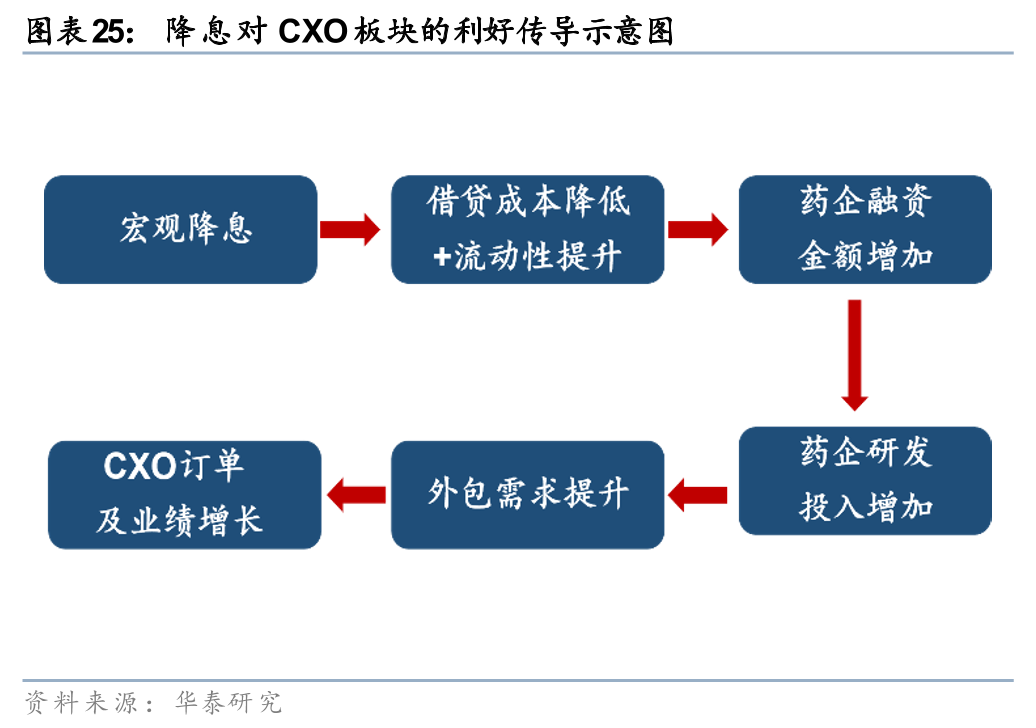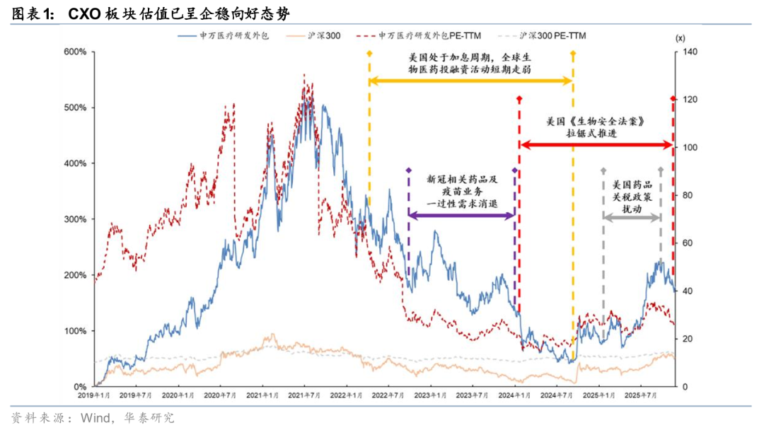 CXO行业经历2H21-1H24相对漫长的调整期后,外部扰动因素已逐渐好转,包括:1)美国生物安全法案冲击已边际减弱,股价表现逐渐免疫;2)美国药品关税实质性影响有限(临床及开发阶段为研发服务类免关税,CDMO直接商业化对美国敞口较小);3)新冠业务高基数已基本消化等。我们认为,行业最差时期已过,并已进入新一轮上行周期,主要基于:1)海外:投融资已率先恢复且降息通道已开启,经过2-4个季度的传导周期后,有望显著提振CXO行业需求;2)国内:BD出海交易如火如荼,IPO环境亦明显改善,资金逐渐传导后将拉动量增,26年起报表端增量将陆续落地。