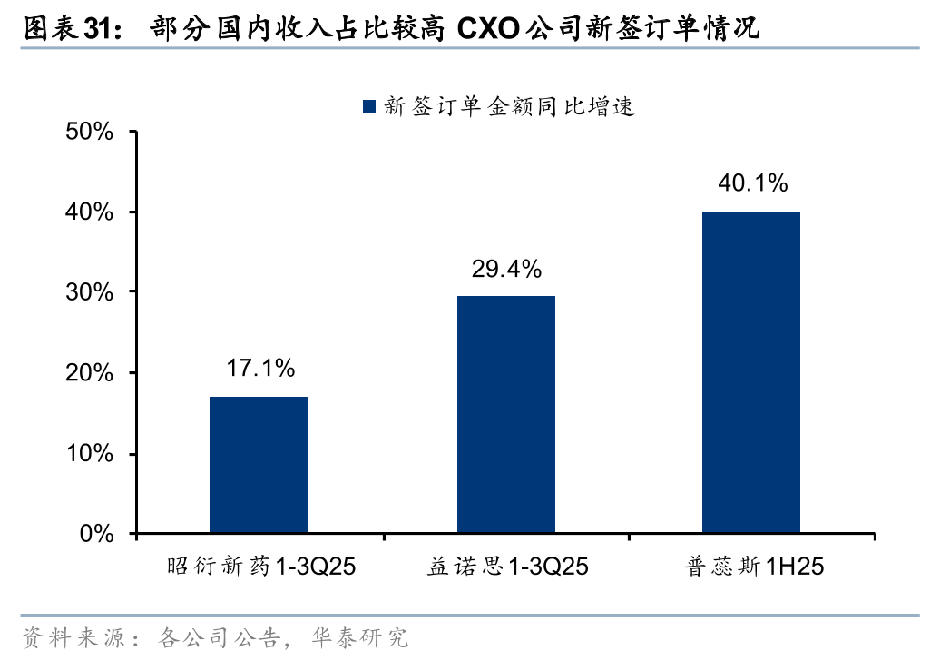 价稳量增,订单先行,内需型CXO报表端有望于26年起陆续迎来曙光。国内CXO市场经过23-24年集中的竞争降价后,各个阶段的业务基本都于25年迎来价格的企稳(包括药物发现、安评、临床阶段等)甚至略有反弹。因需消化历史订单同比降价的压力(根据益诺思和诺思格招股书,一般安评从新签到收入确认平均约1年,临床CRO及SMO根据项目类型差别一般1-3年确认周期),内需型CXO公司(国内收入占比较高)25年报表端(收入、归母净利润等)普遍承压,但订单端普遍已明显恢复(昭衍新药、益诺思1-3Q25新签订单金额同比分别增长17.1%、29.4%,普蕊斯1H25新签订单金额同比增长达40.1%)。我们预计从26年开始,内需型CXO公司报表端将陆续迎来边际好转。