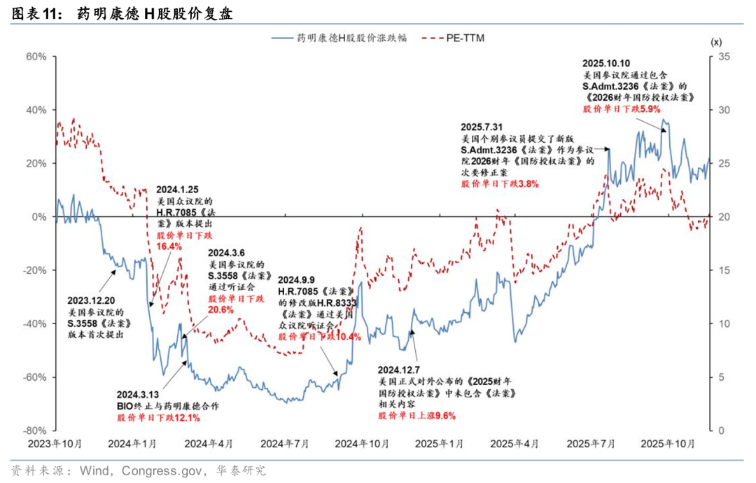 4)法案2.0版本审议阶段:2025年7月31日,美国个别参议员提交了新版S.Admt.3236《法案》作为参议院2026财年《国防授权法案》的次要修正案;而后,美国参议院于2025年10月10日通过该版本NDAA。与2024年版本相比,新版《法案》未提及具体公司(改为参考美国国防部的“1260H清单”及《法案》生效后一年内公布的“特定生物技术公司实体名单”,但被纳入实体名单的公司拥有90天申诉期),后续名单中的相关公司将被立即禁止与美国联邦机构及其业务伙伴展开合作,但对于既往已经签署的合同则拥有长达5年的豁免期。截至目前,包含新版《法案》内容的2026财年NDAA进入参众两院最后的审议阶段。受此影响,CXO板块估值于关键事件对应节点后有所回调,但幅度相较2024年相关事件影响已明显收窄。