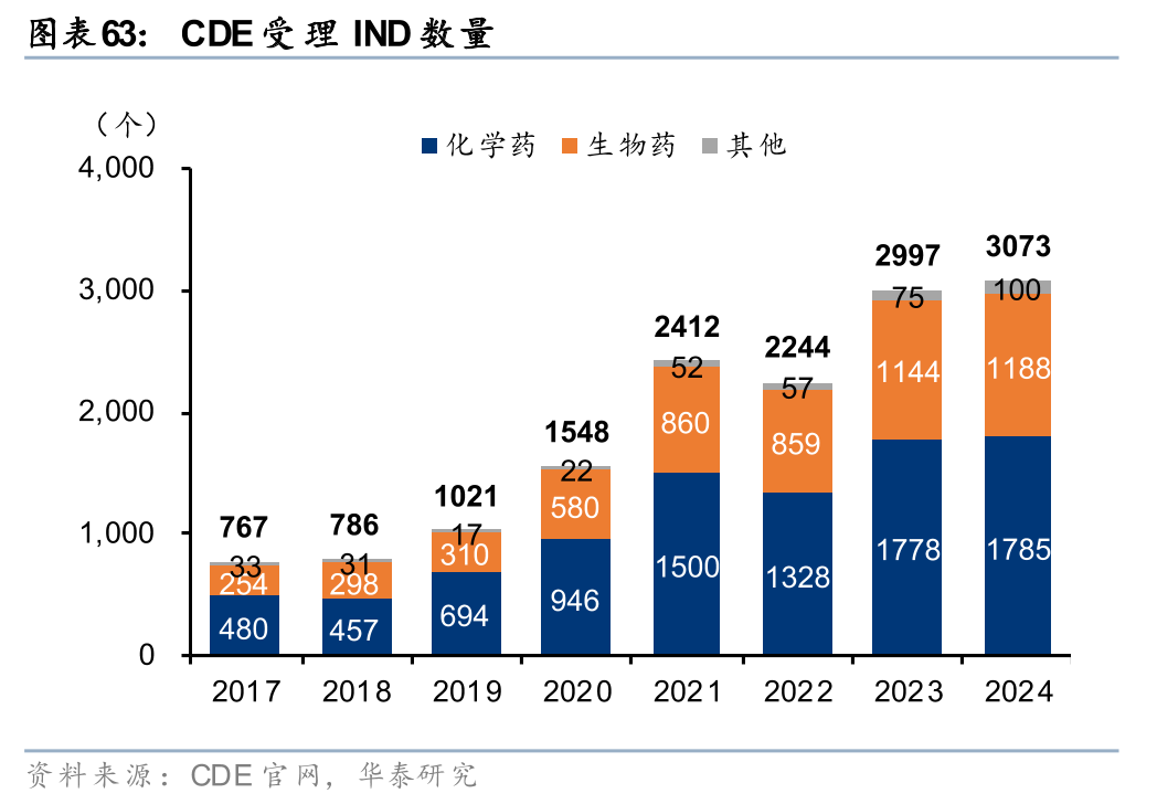 中美IND数量保持高位,新药研发热度持续。中国及美国新药注册活动均整体保持向好态势。根据国家药品监督管理局药品审评中心(CDE)的资料,CDE受理的新药临床试验申请(IND)由2017年的767项快速增长至2021年的2412项(2018-2021年CAGR=33.2%),2022年数量虽受全球生物医药领域投融资活动的阶段性下滑而小幅回落,但2023年已恢复增长,并于2024年提升至3073项的历史新高(2022-2024年CAGR=8.4%);与此同时,根据FDA官网,2024年美国以商业化为目的的新药IND申请数为1139项(yoy+7.3%)。中美市场新药IND受理数均维持高位,进一步证明以中美为代表的全球新药关键市场的研发热度,并有望积极提升相关新药后续商业化阶段的需求空间。