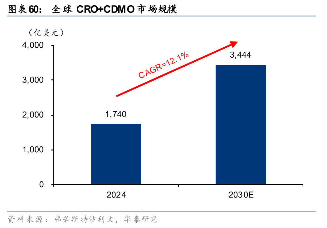 行业规模持续提升,中国CXO企业竞争力明显。伴随医药行业的持续快速发展,CXO企业在周期漫长、流程复杂且投入高昂的药品研发及生产过程中所发挥的作用日益重要。根据弗若斯特沙利文的资料,2024年全球CRO+CDMO市场规模为1740亿美元,其预计到2030年将达3444亿美元(CAGR=12.1%);其中,2024年中国CRO+CDMO市场规模约占全球总规模的14.8%,其预计到2030年将达4823亿元(CAGR=17.5%),整体快于全球行业平均水平。我们看好中国CXO企业积极展现自身竞争力,助力国内市场更快增长,主因:1)全球新药研发及外包活动持续推进,驱动行业需求积极释放;2)中国CXO底层优势明显,热门板块产能有序扩张。