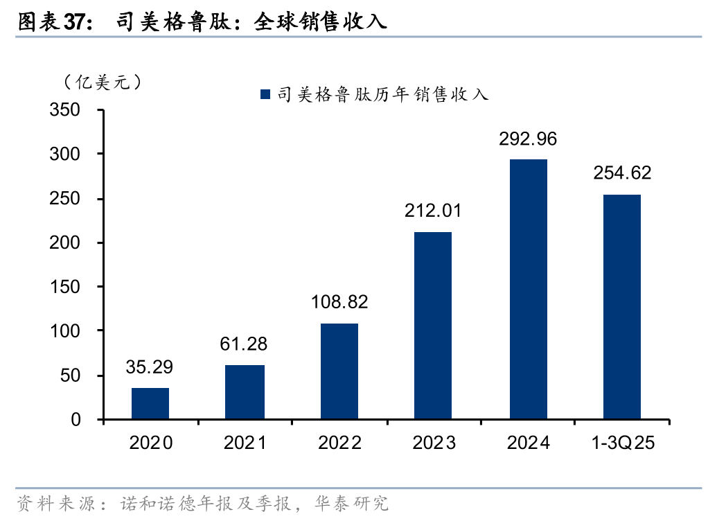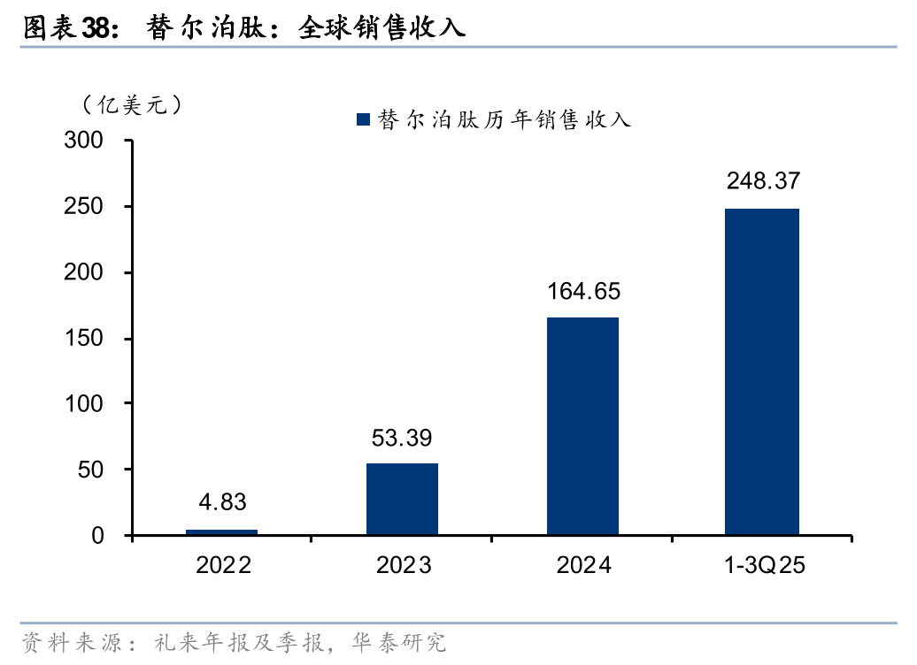 明星品类频出,司美格鲁肽登顶全球“药王”,替尔泊肽奋起直追。基于庞大的患者人群(2型糖尿病、肥胖症等)及突出的治疗效果,多肽类尤其GLP-1类药物上市后实现了陡峭的放量,其中:1)司美格鲁肽:根据诺和诺德公告,24年司美格鲁肽全球销售额达292.96亿美元,同比增长38.2%,并于1-3Q25达成254.62亿美元销售额并超过默沙东的帕博利珠单抗成为全球新“药王”;2)替尔泊肽:根据礼来公告,其双靶点药物替尔泊肽凭借更优的减重及降糖效果于22年上市后奋起直追,24年实现销售额164.65亿美元,同比增长208.4%,并于1-3Q25达成248.37亿美元销售额,与司美格鲁肽基本持平。