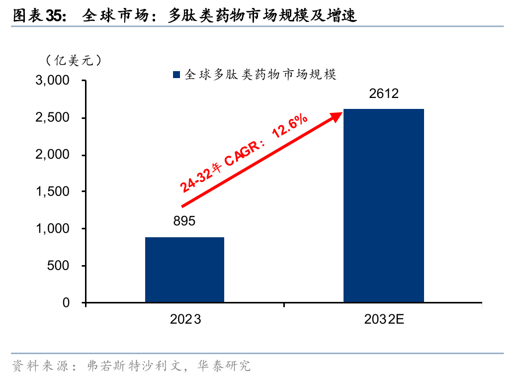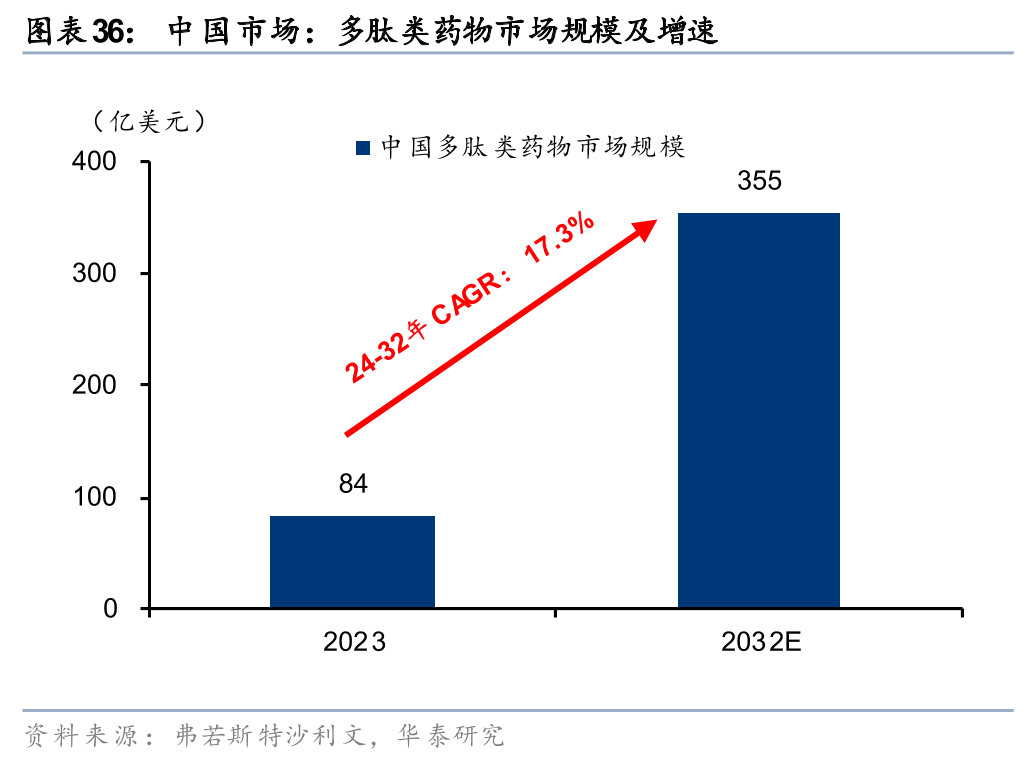 多肽类药物优势明显,行业蓬勃发展。多肽类药物是通过生物合成或化学合成获得的具有特定治疗效果的多肽,其在分子结构上处于小分子和蛋白质之间,主要包括胰岛素多肽及非胰島素多肽两大类。与小分子药物或抗体药物相比,多肽类药物具有靶点特异性和效力更高、副作用较少以及易于传递等优势。近年来,伴随GLP-1等具备变革性的多肽药物的出现,代谢性疾病(尤其是2型糖尿病及肥胖症等)的格局被逐渐改写,也带动了多肽行业的蓬勃发展。根据弗若斯特沙利文的数据,全球多肽类药物市场2023年规模为895亿美元,其预计到2032年行业规模将达到2612亿美元(2024-2032年CAGR为12.6%);中国多肽类药物市场2023年规模为84亿美元,其预计到2032年规模将达到355亿美元(2024-2032年CAGR为17.3%)。
