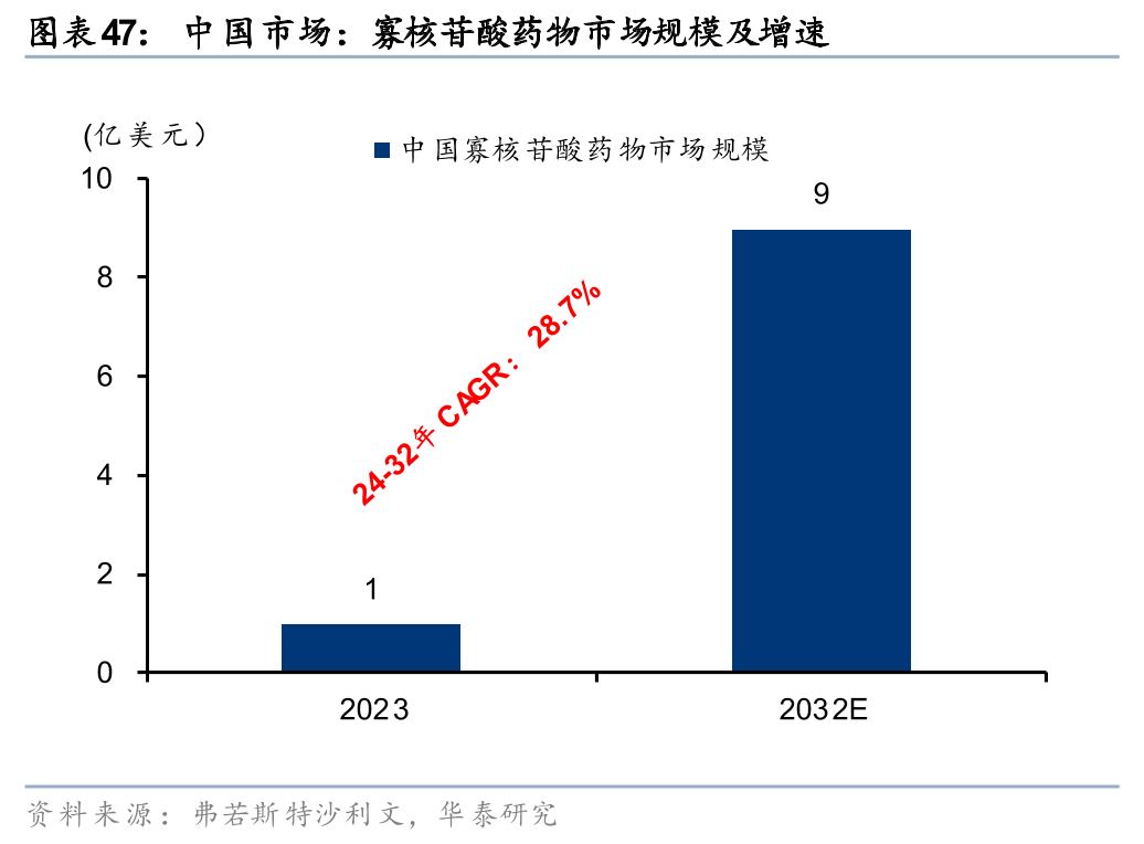 寡核苷酸药物市场快速增长。寡核苷酸指一类合成核酸聚合物,通常由约20个核苷酸的单链或双链分子组成。其用于通过各种机制调节基因表达,包括ASO、RNAi及核酸适配体等。目前全球范围已有多款寡核苷酸药物上市,主要适应症包括原发性高草酸尿症、原发性高胆固醇血症及神经退化疾病(如肌萎缩性脊髓侧索硬化症)等,其中销售收入最高的寡核苷酸药物为Ionis Pharmaceuticals, Inc.开发的一种ASO药物Spinraza (Nusinersen),其2023年全球销售额为17.41亿美元(根据泰德医药招股书)。寡核苷酸药物市场快速发展,根据弗若斯特沙利文数据,全球寡核苷酸药物23年市场规模为45亿美元,其预计到2032年将达到459亿美元,24-32年CAGR达29.6%;中国寡核苷酸药物23年市场规模为1亿美元,其预计到2032年将达到9亿美元,24-32年CAGR达28.7%。
