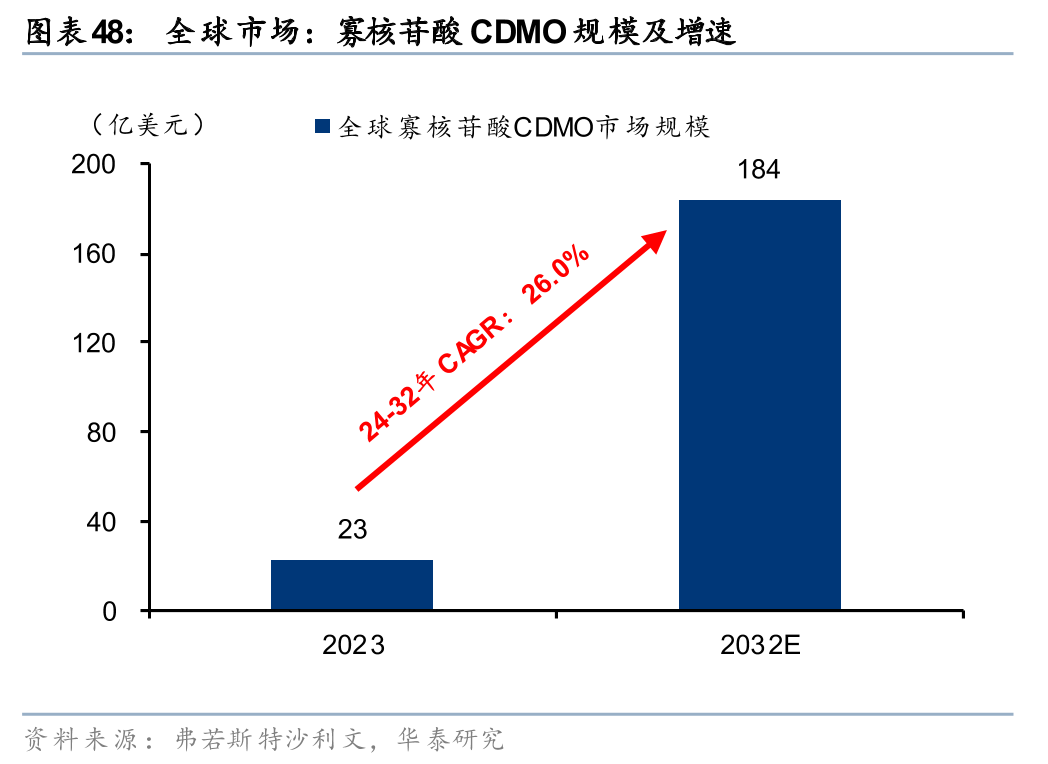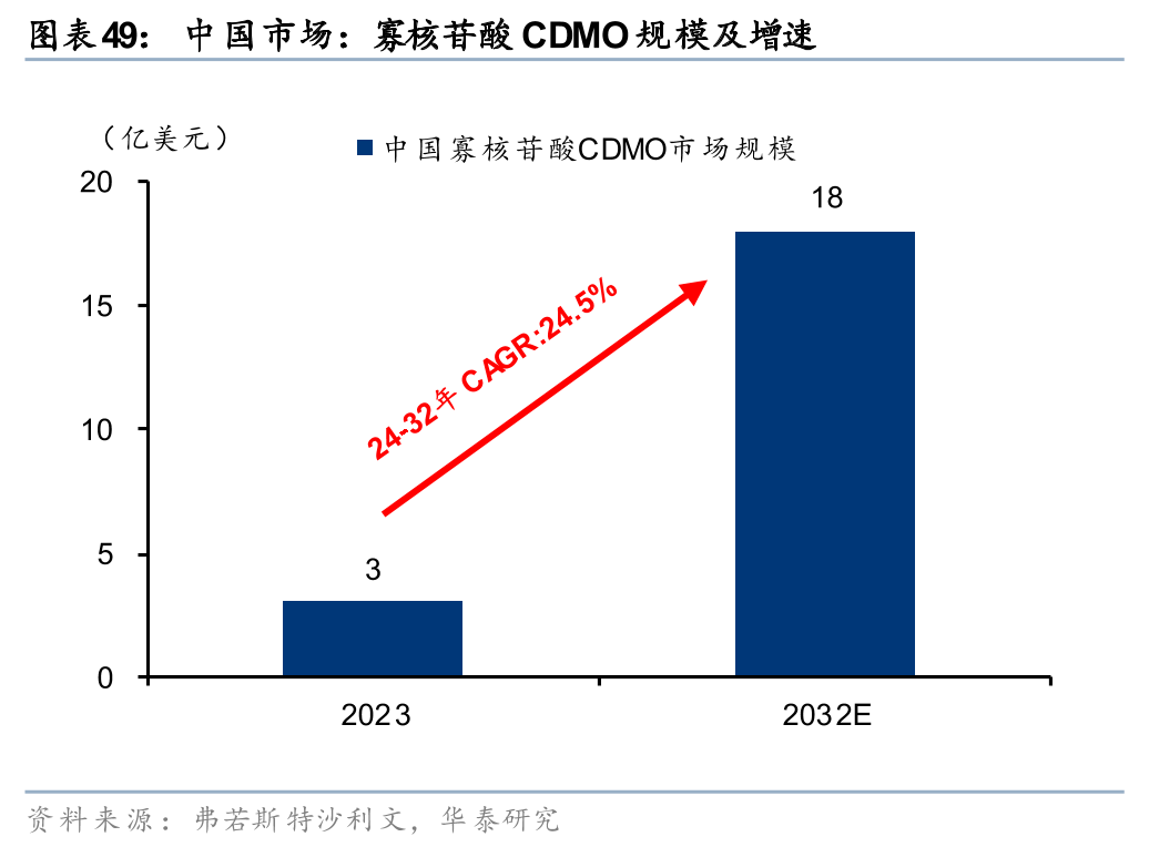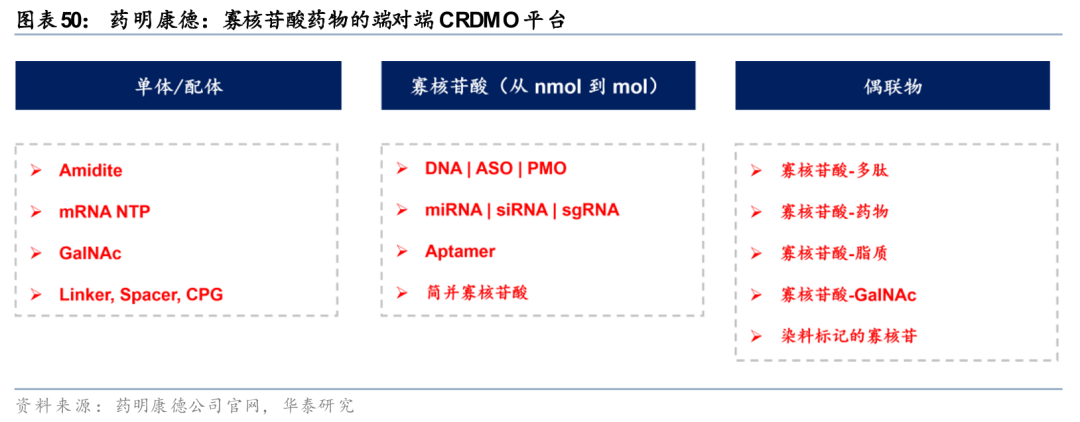 寡核苷酸药物对外包依赖度较高,对应寡核苷酸CDMO市场高速增长。寡核苷酸药物的合成、纯化及生产同样具备高技术壁垒(合成寡核苷酸需要高精度的自动化仪器和复杂的纯化步骤),其对CXO公司的依赖度亦较高。根据弗若斯特沙利文数据,全球寡核苷酸CDMO市场23年规模为23亿美元,其预计到2032年将达到184亿美元,24-32年CAGR达26.0%;中国寡核苷酸CDMO市场23年规模为3亿美元,其预计到2032年将达到18亿美元,24-32年CAGR达24.5%。国产主流CDMO供应商亦在寡核苷酸领域有较好布局。以药明康德为例,其目前已构建了寡核苷酸药物的端对端CRDMO平台,涵盖从药物发现到临床开发与商业化阶段的所有服务,其发现合成服务支持高通量库合成和定制合成,服务涵盖所有类型的寡核苷酸及其单体、连接子、配体和偶联物。