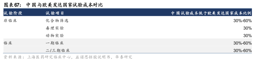 2)产业链完整性全球领先,项目交付效率高且成本低:中国目前已建立了全球最为完整的制造业体系,拥有成熟的化学化工及生物医药配套供应链。国内CXO企业所需的绝大多数上游原料和配套设备、耗材在国内均有满足项目高标准交付的可靠供应商,能够在降低整体成本的同时切实保障供应链安全性。与此同时,凭借多年积累的项目经验,国内CXO企业在承接客户订单后普遍拥有更高的交付效率。除此之外,中国的CXO项目与欧美发达国家的同类项目相比,普遍拥有更低的单位成本;根据上海医药研究临床中心的资料,相比欧美发达国家,我国医药企业在研发生产的各主要阶段上都有明显成本优势(仅占欧美发达国家试验成本的30%-60%)。
