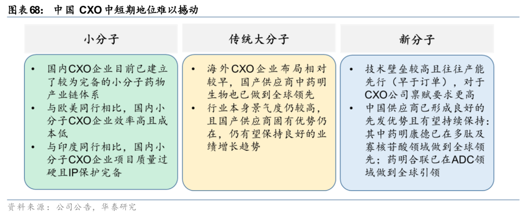 1)小分子:国内CXO企业目前已建立了较为完备的小分子药物产业链体系,其中部分行业龙头已建成了从前端药物发现到后端商业化生产的一体化能力(如药明康德、康龙化成等);与欧美同行相比,国内小分子CXO企业效率高且成本低,与印度同行相比,国内小分子CXO企业项目质量过硬且IP保护完备,中短期行业竞争力难以撼动;