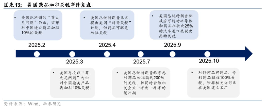 3)药品关税政策摇摆期:2025年4月8日,美国总统特朗普称此前“对等关税”政策未涉及药品,后续将考虑为药品设定单独关税。7月8日,美国总统特朗普称考虑对药品加征高达200%的关税,但同时会给相关企业一年到一年半的缓冲期。9月16日,美国总统特朗普称政府可能对半导体和药品征收比25%的汽车进口关税更高的关税。