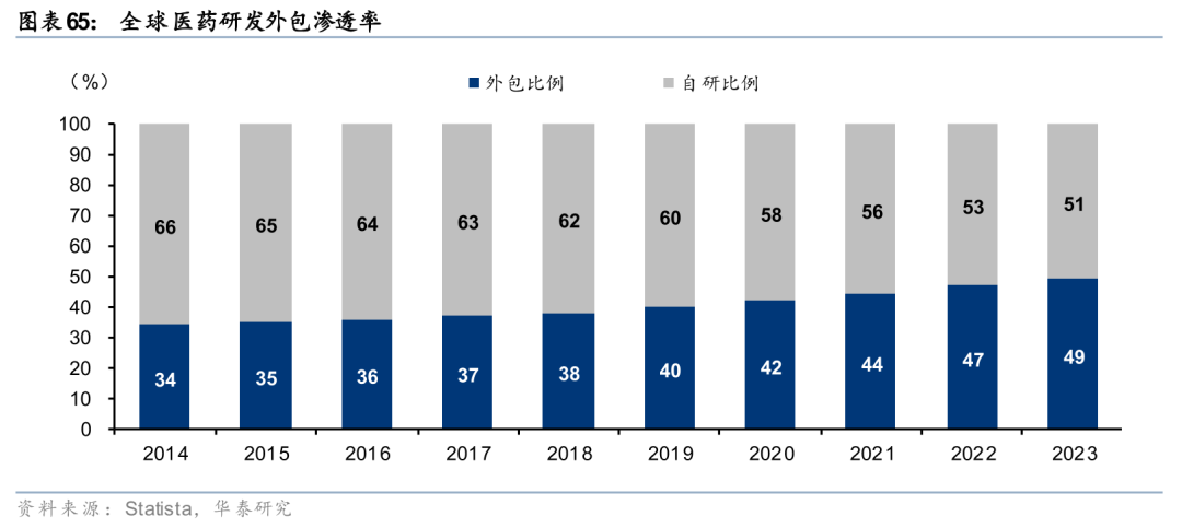 研发生产分工细化,CXO外包大势所趋。由于药物研发生产充满变数且同业竞争日趋激烈,越来越多的大型药企将其部分研发生产业务外包给CXO企业以提升效率;与此同时,由于中小型Biotech公司通常只在某一细分领域拥有科学技术优势,且自身生产能力往往有限,选择与技术成熟的CXO企业进行合作已成为其加快推进产研进度的主流选择。根据Statista的资料,全球药品市场的外包渗透率呈现逐年提升态势,整体已从2014年的34%提升至2023年的49%。