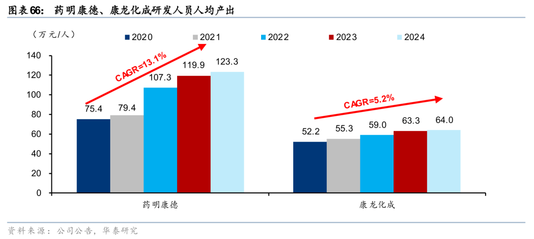 1)技术人员素质持续提升,持续享受工程师红利。根据教育部数据,截至2023年底,我国已累计培养1100多万名研究生,其中2012-2023年期间共培养了670多万名硕士和60多万名博士。得益于理工科高端人才规模的持续扩大,为包括CXO行业在内的技术驱动型本土企业奠定了快速发展的人才基础。凭借国内行业端的工程师红利,国内CXO企业(尤其是头部企业)持续提升技术人员综合质量,研发人员人均产出保持积极增长。