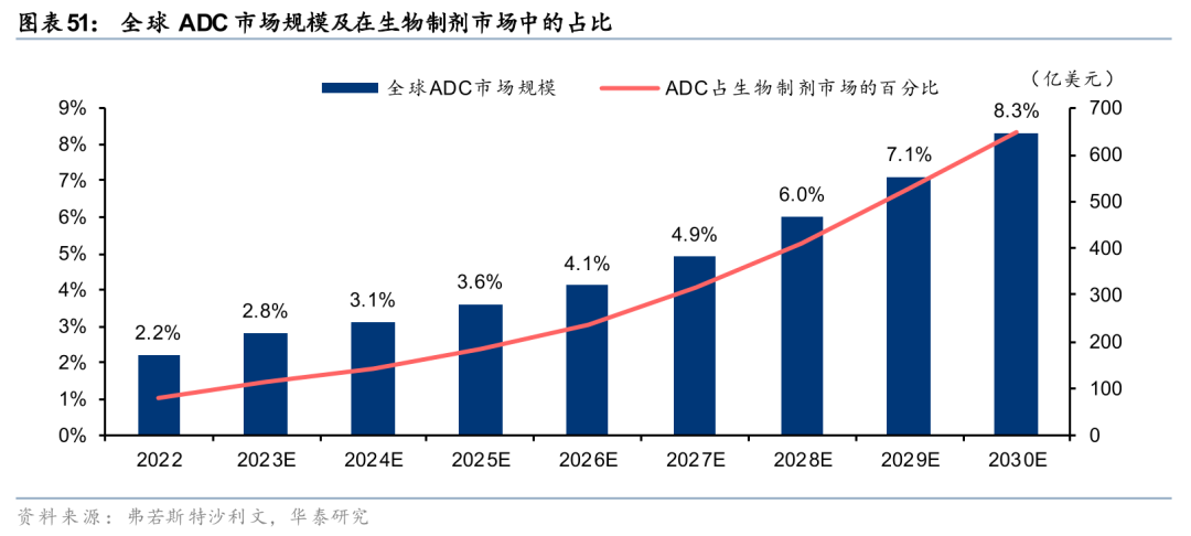 ADC药物优势突出,行业发展欣欣向荣。ADC是一种创新的生物制剂药物治疗方法,由通过专门设计的连接子将小分子药物(即细胞毒性有效载荷)连接到生物成份(即抗体)上组成。传统ADC药物利用抗体与肿瘤特异性抗原结合,将有效载荷输送到目标癌细胞,然后释放有效载荷导致癌细胞死亡。ADC结合靶点选择性抗体及高活性细胞杀伤毒性药物,并显示出与目前的标准护理疗法相比具有显著改善治疗窗口的潜力。近年来,伴随新偶联技术的出现、药物抗体比率优化及连接子设计改善等,该领域发展明显加快(包括从ADC向XDC、AXC扩展等)。根据弗若斯特沙利文的资料,2022年全球ADC市场规模为79亿美元,其预计2030年将达647亿美元,2023-2030年CAGR约30.0%,且ADC药物在整体生物制剂市场中的份额预计将由2022年的2.2%增至2030年的8.3%。