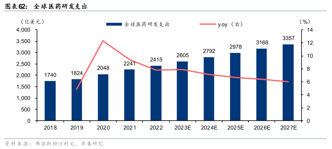 全球药物研发投入持续增长,贡献行业发展原动力。全球医药市场整体保持快速发展趋势,为新药研发提供了良好的外部环境。根据弗若斯特沙利文的资料,2022年全球医药研发投入达2415亿美元(2019-2022年CAGR=8.5%),其预计2027年将达3357亿美元(2023-2027年CAGR=6.8%)。不断提升的药物研发投入意愿,有望积极为CXO行业的持续增长贡献原动力。