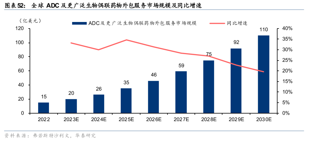 ADC高技术壁垒高外包率,助力ADC CRDMO行业快速扩容。ADC领域技术壁垒较高,其发现、开发及制造过程需要生物制剂及小分子化合物两方面的跨学科专业知识,主要难点包括ADC设计及发现偶联场景,高活原料药的处理,载荷、载荷-连接子结合物、ADC分子、抗体分子等在内的不同中间体和成品的CMC,偶联优化和制剂制备工艺的复杂性及供应链管理等。基于此,ADC领域截至2022年底的外包率达约70%,明显高于整体生物制剂的外包率(34%,数据来自弗若斯特沙利文),且ADC外包服务市场亦快速增长。根据弗若斯特沙利文的资料,2022年全球ADC及更广泛生物偶联药物外包服务市场规模达15亿美元,其预计到2030年将增至110亿美元,2023-2030年CAGR高达28.4%。