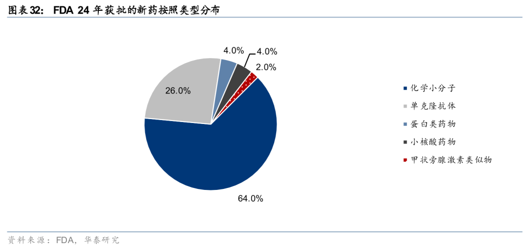 产业升级进行时,多肽、ADC、寡核苷酸等新分子蓬勃发展。近年来,传统小分子行业稳健发展,且仍为新药开发领域的主力(根据FDA数据,美国药品评价与研究中心24年共批准了50款新药,其中化学小分子药物占比64%,其余包括单克隆抗体、小核酸药物、蛋白类药物等)。但伴随行业发展到一定成熟度后,传统小分子领域开发难度逐渐提高且供应商拥挤度亦逐渐提升,而以多肽、ADC、寡核苷酸等为代表的新分子药物纷至沓来,成为创新药及CRDMO领域发展的重要新兴力量和驱动力。