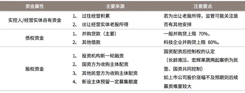 从收购资金来源看,站在收购方实控人的角度根据资金属性可以分为自有资金、债权资金、股权资金,具体情况如下表所示: