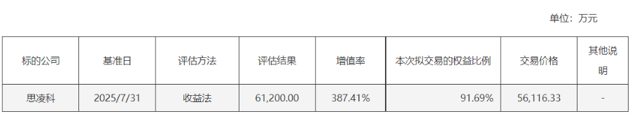 截至2025年7月31日,标的公司思凌科100%股权的评估值为6.12亿元,标的公司合并报表口径归属于母公司股东所有者权益账面价值为12556万元,增值率为387.41%。