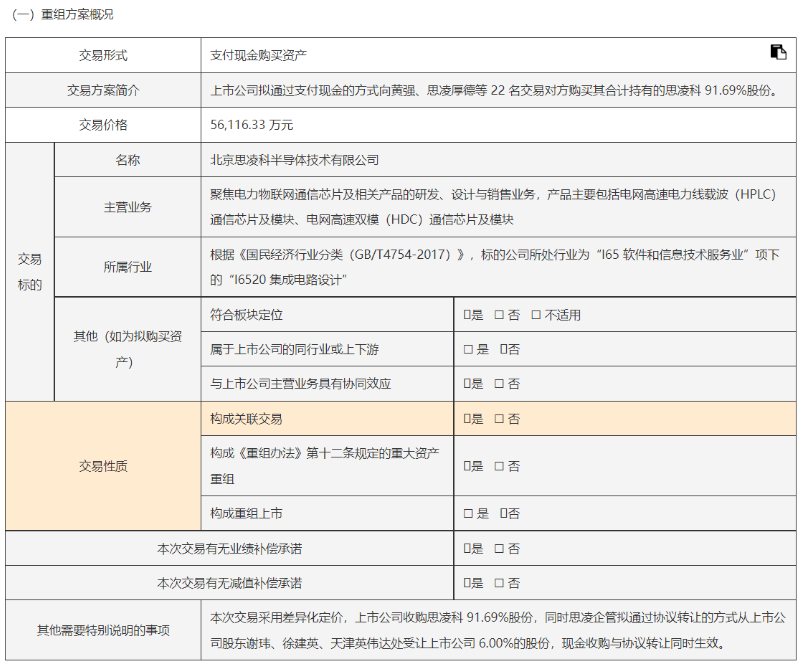 12月28日晚间,通业科技发布公告披露,公司拟以5.61亿元的价格收购思凌科91.69%股份。资料显示,思凌科主要从事电力物联网通信芯片及相关产品的研发、设计与销售。此次交易构成重大资产重组,不构成重组上市。