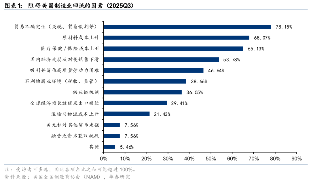 欧美“再工业化”存在多方面挑战。由于产业结构变化、缺乏产业支持政策、环境保护、劳动力价格等因素,欧美上世纪即开始出现制造业外流。尽管欧美已意识到“去工业化”会造成制造业岗位流失、经济空心化、产业失衡等负面影响,但“再工业化”并非易事。以美国为例,根据美国全国制造商协会(NAM)统计,2025Q3阻碍制造业回流的因素涉及贸易不确定性、原材料成本、用工成本等多方面。
