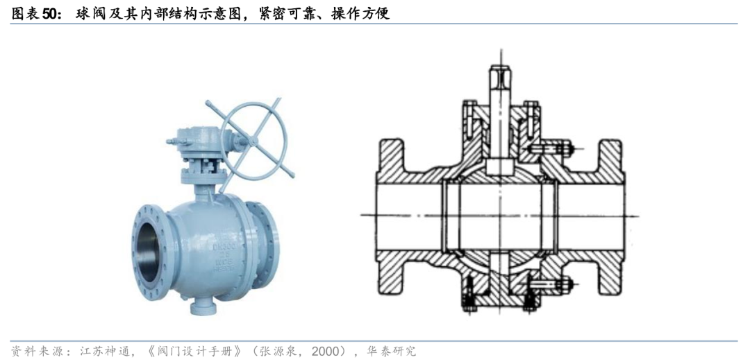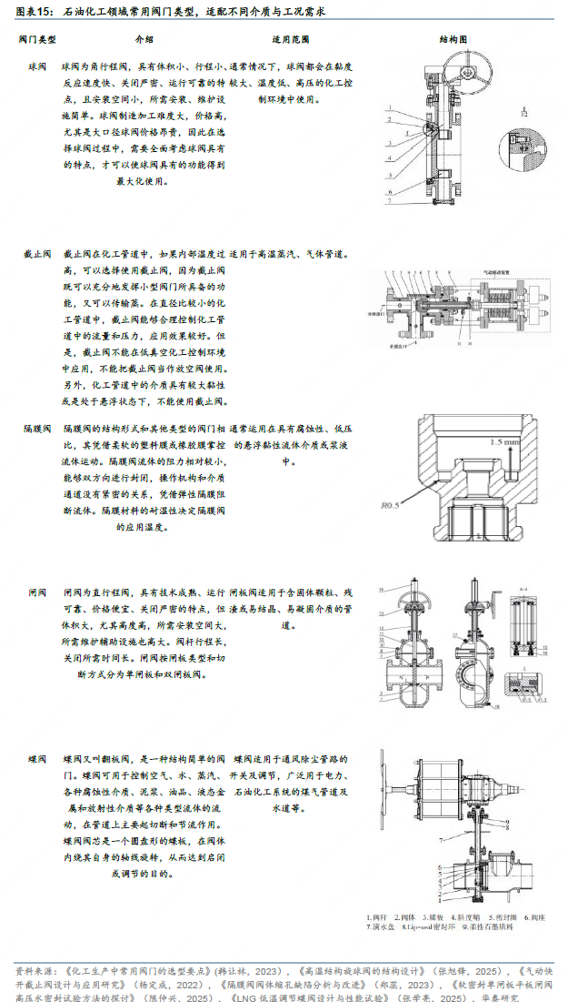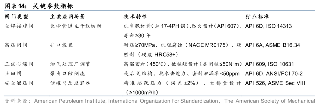 阀门贯穿油气全流程应用,保障稳定高效运行。阀门的应用渗透在油气采输的各个环节中,从井口装置与开采控制,到长输管道系统,再到储运与终端处理,是全流程稳定安全高效运行的重要保障。所用核心产品包括:(1)井口与开采中的高压闸阀、三偏心蝶阀;(2)输送过程中的全焊接球阀;(3)储运与终端处理中的止回阀、安全泄压阀。该领域对阀门“耐高压、抗腐蚀、零泄漏”三位一体的要求凸显。