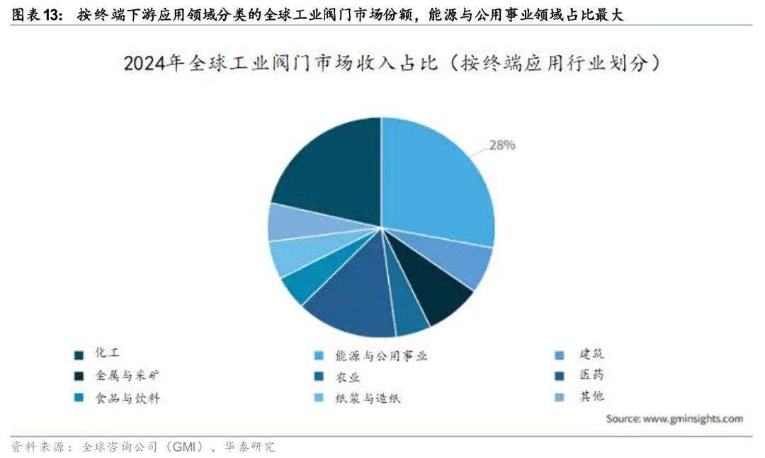 GMI报告显示,2024年全球工业阀门市场中,能源与公用事业领域以28%的份额居首,成为阀门最大需求来源。这一领先优势源于全球能源需求总量扩张与能源结构多元化共振,全球能源需求持续增长以及各国在新能源和可再生能源领域的投入增加,包括风能、太阳能、水力、核电及传统煤电、燃气电等多元化能源结构建设,均带动阀门需求稳步提升。分领域看,阀门选型与介质特性深度绑定,煤电、燃气发电领域以高温高压蒸汽为主,闸阀因全开位流阻低、密封可靠,占该类项目阀门总量的30%;核电强调核级安全,截止阀凭精准调节与良好密封优势,用于反应堆冷却系统,占核电阀门用量的25%;在水电站和部分可再生能源发电项目中,蝶阀则以启闭迅速、适应大流量特点,广泛用于水量调节,占水电项目阀门需求量的约20%。在能源系统中,阀门均承担流体调节与超压保护功能,是保障发电及输配过程安全高效的核心组件。