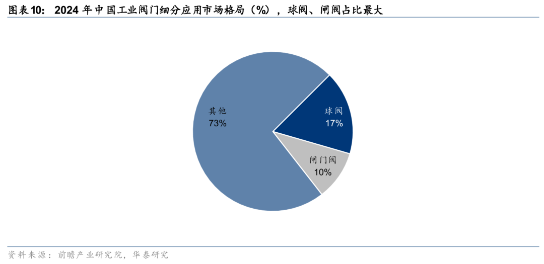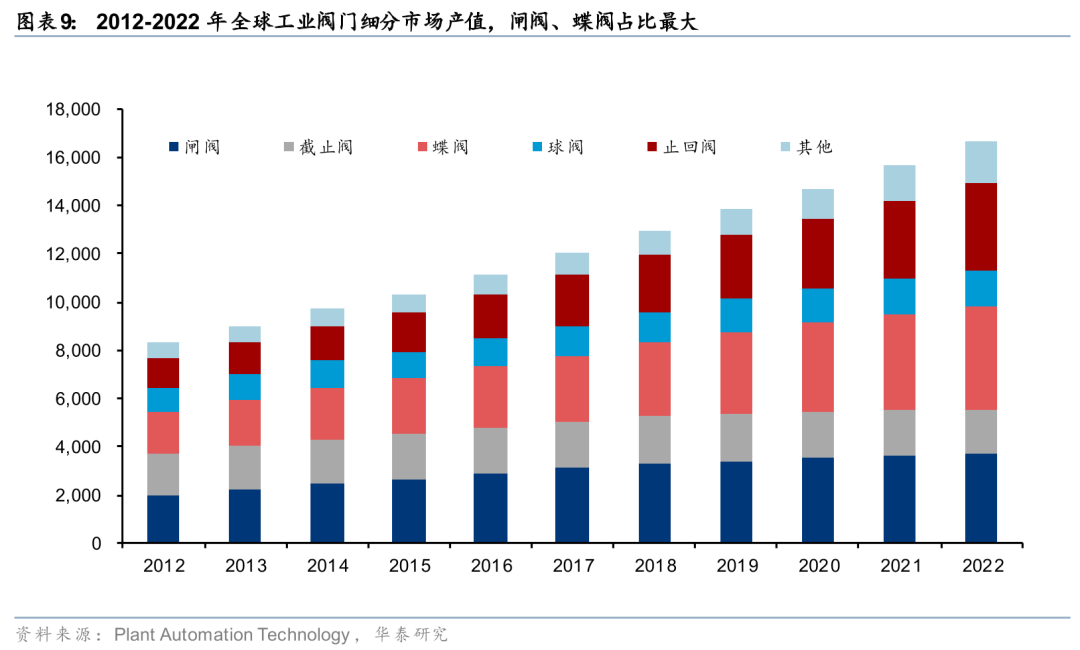 全球阀门市场中,闸阀、截止阀、蝶阀、球阀、止回阀为工业阀门中的主要组成部分,五类总和市场占比超90%。其中,闸阀、蝶阀是最大的两个细分市场,且在2012至2022年间稳定增长;截止阀占比增长迅速,与闸阀、蝶阀的体量差距逐渐缩小。中国阀门市场的产品结构略有不同,2024年,球阀、闸阀成为阀门制造业最大细分市场,占比分别为17%和10%。