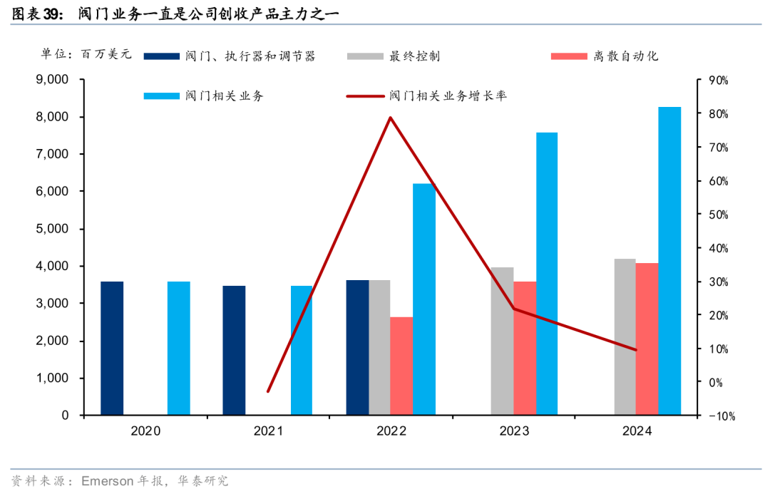 业务口径调整,阀门板块强化核心地位。根据Emerson年报披露,阀门业务一直是公司创收主力之一。2023年公司进行统计口径调整并对2022年的数据进行了回溯,从原先在“自动化控制业务”板块下细分出“阀门、执行器和调节器”业务的基础分类方式,调整为“智能设备”板块下细分出“最终控制”和“离散自动化”业务。其中“最终控制”包括控制阀、隔离阀、截止阀、泄压阀、压力安全阀、执行器和调节器等制造业务,与原先“阀门、执行器和调节器”的覆盖范围相同,“离散自动化”包括电磁阀、气动阀、阀门位置指示器、气缸和执行器、空气制备设备、压力和温度开关、电动直线运动解决方案、可编程自动化控制系统和软件、配电设备等,新纳入了阀门相关的软硬件制造与销售。