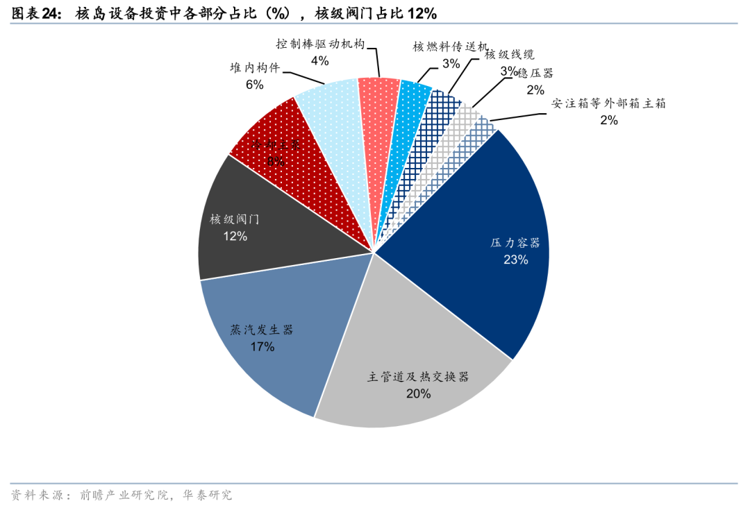 新建核电机组维保需求爆发。逐步扩大的核电机组数量和总装机容量将创造大量核电阀门需求,其中核电阀门占新增核电设备总价值量的12.42%,以造价约1.6万元/KW(中国核电)的“华龙一号”为例,百万千瓦核电机组投资总额为160亿,参考《核电项目全寿命周期成本控制研究》(周有胜,2019),设备投资占总工程造价的38.6%,则阀门占总造价的4.79%,约为7.7亿元。此外,参考国际能源网,两台百万千瓦机组的核电站每年总维修费用在1.35亿元左右,其中阀门维修支出占维修总支出的50%,总装机容量的扩大也会提振维保需求。