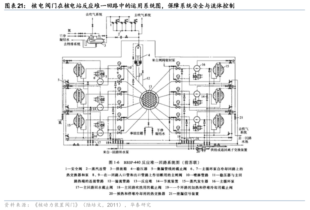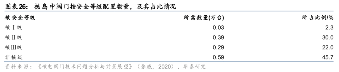 核电站对阀门需求量大幅高于同容量火电站。根据《核电阀门技术问题分析与前景展望》,根据目前我国核电发展情况,与同容量级的火电站相比,核电站需求的阀门数量为同容量级的火电站的2-3倍。以容量为80万kW的核电站为例,通径DN25-1000mm的阀门需求量为8000-10000台,典型的一座200万kW级核电机组的核电站需各类阀门3万台左右。详情如下表所示。