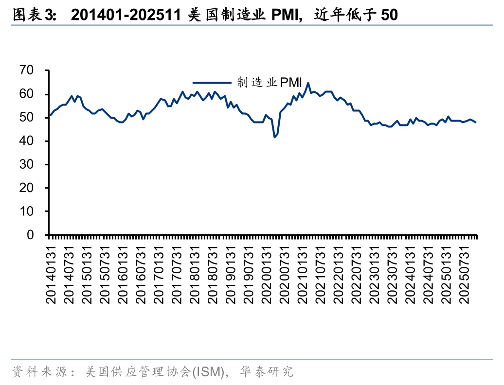 基础设施、产业结构、劳动力成本等问题阻碍美国“再工业化”。基建方面,落后的基础设施是美国再工业化的重要掣肘,要实现大规模更新,巨额投入与漫长周期是基本要求,但资金短缺与效率低下构成了当前难以逾越的现实瓶颈。长期“去工业化”使美国经济倚重服务业,要重塑制造业,就必须逆转这一产业结构趋势。然而,这种高成本的调整与资本增值的内在逻辑相悖,因此缺乏市场动力。在劳动力方面,美国面临高成本与低供给的双重困境。一方面,美国工人平均小时工资是新兴市场的6-8倍;另一方面,因经济“脱实向虚”,愿从事制造业的工人稀少,导致熟练工严重短缺。德勤与美国制造业研究所报告预测,到2033年美国半数岗位可能无人可用。以上都将成为阻碍美国“再工业化”的重要因素。近年来,美国制造业PMI长期低于50荣枯分界线,表现出美国制造业发展不足。