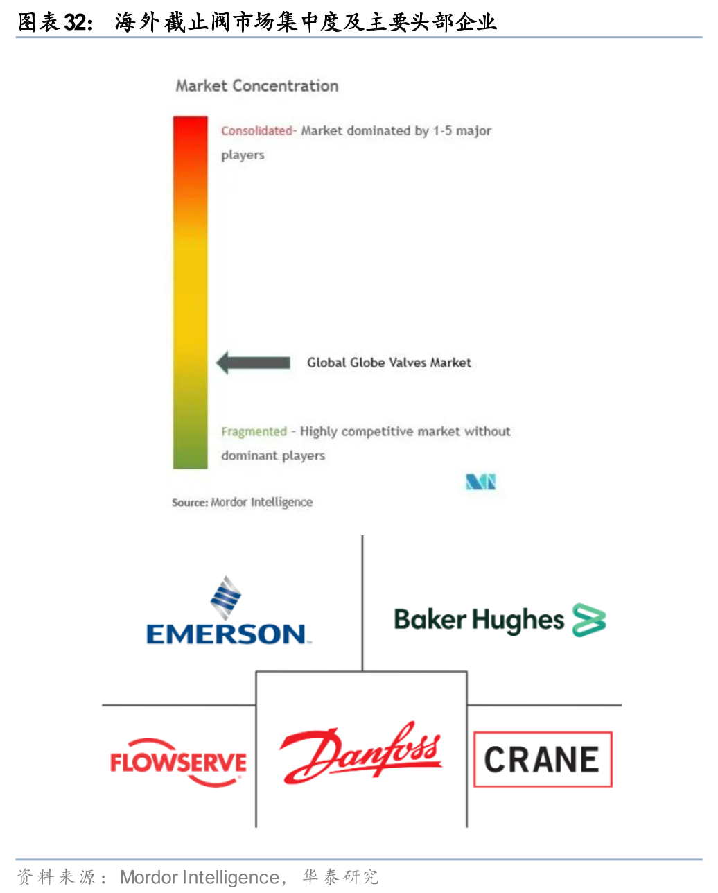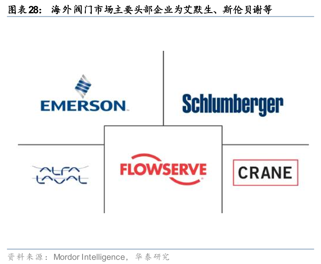 市场集中度整体适中,头部企业寡头竞争。根据Mordor Intelligence,全球阀门市场整体集中度适中,参与者较多,五大主要参与者拥有较多市场份额,且处于持续扩张时期,寡头竞争格局明显。主要头部企业有Emerson Electric Co.、Schlumberger Limited、Alfa Laval Corporate AB、Flowserve Corporation和Crane Co。