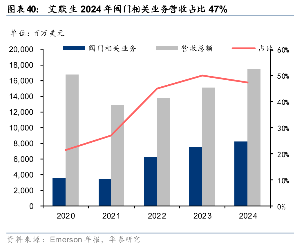 阀门业务实现营收利润双增长。2020-2021年,“阀门、执行器和调节器”业务分别贡献了21.4%、26.9%的营业收入,统计口径调整后,阀门相关业务的营收贡献突破45%,成为重要主力军。就绝对值而言,阀门相关业务的营收除2021年稍有回落外(增长率-3%),整体逐年增长,尤其在细化统计口径后,2022年阀门营收突破62亿美元,2023年增长率高达21%,营收总额突破75亿美元,2024年维持正增长,增长率9.3%,总额突破82亿美元。此外,阀门业务利润也逐年增长,从2022年11.34亿美元稳步增长至2024年14.43亿美元。2024年按地理区域划分的销售额为:美洲地区占50%;亚洲、中东及非洲地区占30%(其中中国占11%);欧洲地区占20%。