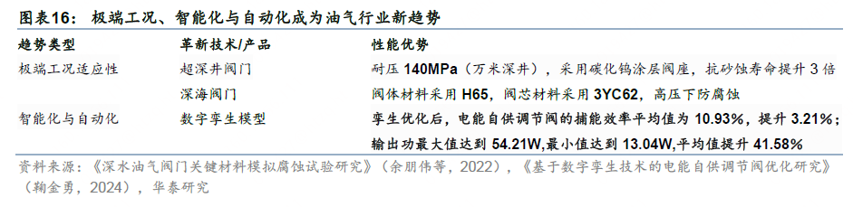 深地深海工况及智能化趋势推动阀门在承压能力、抗腐蚀性与智能运维方面持续突破,为极端环境下设备安全高效运行提供有力保障。随着行业向深地深海作业持续推进,超深井和深海环境对阀门提出了更高要求:需具备更强的承压能力和优异的耐腐蚀性能。深海阀门在公称压力承载能力上通常是陆地应用阀门的两倍,能够在高压、高腐蚀的深海环境下长期安全运行。同时,2205双相不锈钢在氯化物环境中展现出优异的局部腐蚀和点蚀抗力,相较传统奥氏体不锈钢具有更强的耐蚀性能,已成为深海阀门及超深井外壳及低压段选材的重要方向。此外,智能化与自动化趋势加快,数字孪生技术被创新应用于电能自供调节阀中,显著提升捕能效率和输出功率,推动阀门智能化发展与节能减排。