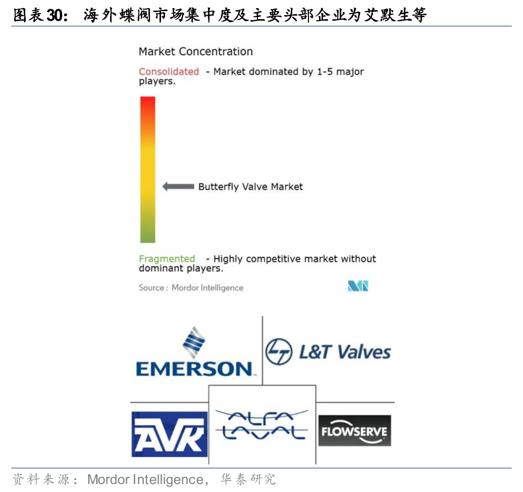 细分市场格局较为相似。从主要阀门类型的细分市场来看,市场集中度差别显著,球阀、蝶阀市场集中度较高,而止回阀、截止阀市场集中度较低,明显低于阀门市场整体市场集中度,更趋向完全竞争。其中,蝶阀市场格局明晰,根据Mordor Intelligence数据,前五头部企业市占率总计55%-60%,该数据可作为比较基准,粗略估计其他市场头部企业的市占率总额。此外,不同细分市场头部企业名单稍有变动,其中Emerson Electric Co.、Schlumberger Limited(包括旗下全资子公司Cameron)、Flowserve Corporation在各细分市场地位稳固,球阀市场中IMI plc、Kitz Corporation成为头部厂家, 蝶阀市场中AVK Holding A/S、L&T Valves Limited不可忽略,止回阀市场中Eaton Corporation、Bosch Rexroth有重要地位,截止阀市场情况稍显复杂,Schlumberger Limited未能位列前五,Baker Hughes Company、Danfoss AS、Crane Co.为主要竞争者。