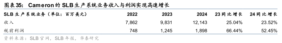 在全球深水油气与LNG高景气拉动下,Cameron所在的SLB生产系统业务收入与利润连续高速增长,体现出高端阀门及海底系统需求的持续强劲。Cameron自2016年被SLB(Schlumberger)收购后,其核心业务整体并入生产系统(Production Systems)分部,成为SLB高端阀门、海底生产系统、地面采油树和阀门解决方案的核心来源。2024财年,SLB生产系统实现收入121.4亿美元,同比增长23.5%(2023年为98.3亿美元),反映出全球深水油气开发与LNG基础设施建设对高端阀门及海底生产系统需求的持续增长。该分部全年税前营业利润为19.0亿美元,同比增长52.5%(2023年为12.5亿美元),利润率提升可能主要得益于高端深水项目交付能力提升及海底业务高附加值订单增加。