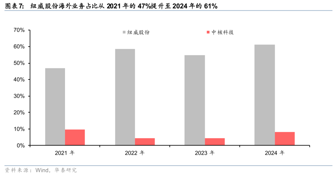 中国制造厚积薄发,创新突破持续涌现。在欧美“去工业化”和东南亚工业基础薄弱背景下,国内企业在中低端通用阀门具备成本与产能优势,在高端领域加速突破关键技术。以纽威股份为例,公司目前已具备大规模制造与交付能力,能够满足全球大项目快速交付需求,产品品类覆盖全面,能够满足复杂应用场景要求。纽威股份产品取得多项国际认证,业务覆盖中东、欧洲等地区,形成全球业务网络,海外业务占比从2021年的47%提升至2024年的61%,表现出在全球市场的强劲竞争力。纽威股份作为行业龙头,2025年前三季度毛利率达到36.93%,同比提升0.21%,这一水平超过了部分国际竞争对手。此外,江苏神通深耕多领域特种阀门,中核科技布局多规格专业化工业阀门。中国阀门品牌凭借高性价比、可靠的产品质量和不断升级的技术能力,国产阀门在国际市场上的认可度持续提升。