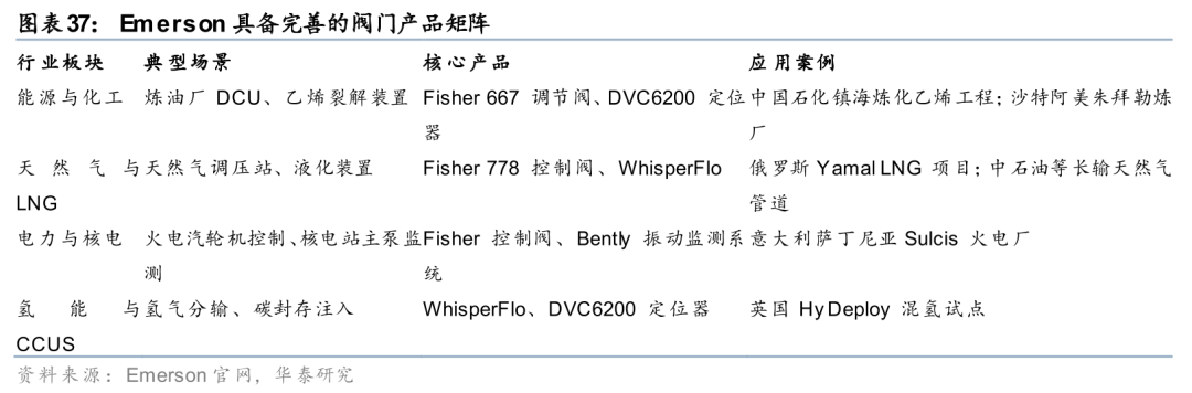 跨国巨头技术壁垒高,持续主导高端阀门市场。尽管全球阀门市场竞争主体众多,但在高端产品领域,国外企业仍占据绝对主导地位。以Emerson、Cameron、Baker Hughes、CIRCOR和Crane为代表的跨国集团,长期深耕石油天然气、核电、军工、航天等高壁垒应用场景,依托其在密封结构设计、高温高压材料选型、系统集成控制、国际认证体系等方面的技术优势,构建起竞争护城河。这些企业不仅能提供标准阀门产品,更能够与自动化系统、井控设备、数字化平台深度整合,实现“一站式过程控制解决方案”,在欧美高端工程项目及深水油气领域仍占据核心供应链主导地位。