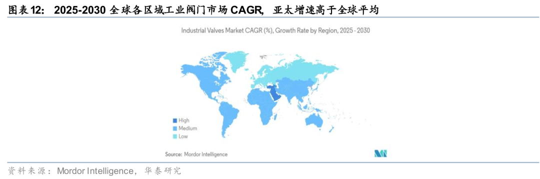 全球阀门市场持续增长。作为工业流体控制体系的核心设备,阀门在石油化工、电力、天然气输送及新能源等行业中发挥着核心作用,能够在复杂多变的工况下实现耐高压、抗腐蚀、精准调节与安全隔离等功能,为各类流程工业的稳定运行提供基础保障。随着工业智能化、自动化水平不断提升,各行业对高性能、高可靠性阀门的需求持续扩大,带动全球阀门市场保持稳步增长。Mordor Intelligence预计全球阀门市场规模将从2025年的743亿美元增至2030年的925亿美元,年均增长率约4.5%,其中亚太地区贡献突出,成为全球阀门需求增长的主要动力来源。