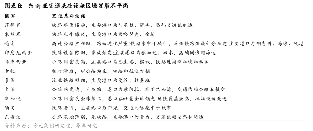 东南亚工业基础设施建设有待提升。东南亚国家在交通物流、能源供应、产业配套、数字基建等多方面存在明显短板,且工业基建项目周期长、资金与财政压力大、投资者信心较低,短期内难以大幅提升工业基础。交通物流方面,新加坡、马来西亚等经济较发达国家的交通基础设施较为完善,但其他东南亚国家仍存在建设滞后、设备陈旧、事故频发等问题,根据世界银行2023年物流绩效指数(LPI),东南亚多个国家物流水平发展落后,排名远低于中国。通信方面,缅甸、老挝等国家存在网络盲区,数字鸿沟阻碍现代制造业发展。能源供应方面,东南亚仍存在电力短缺、供应不稳定等问题,严重影响企业生产,2023年越南发生全国性大停电和轮流限电,导致部分厂商损失惨重。产业配套薄弱、数字基建部署不足等问题也无法满足制造业需求。