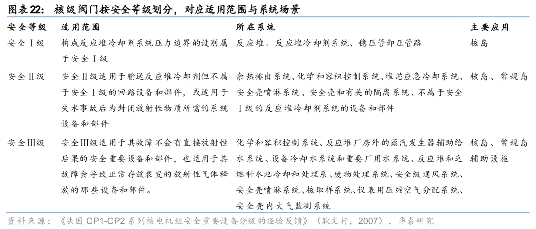 核电站需要大量核级阀门保障核岛安全输送控制需求,核电阀门分级标准严谨。根据《核电阀门知识》和《核级阀门制造过程中的质量控制要点分析及管控对策》,核电的发展少不了配套阀门的使用需求。核电阀门在核电站中是使用数量较多的介质输送控制设备,是核电站安全运行中的必不可少的组成部分。核电阀门是指在核电站中核岛N1、常规岛CI和电站辅助设施BOP系统中使用的阀门。从安全级别上分为核安全Ⅰ级、Ⅱ级、Ⅲ级、非核级,其中核安全Ⅰ级要求最高。核电机组内不同安全等级的使用范围也有明确的范围界定,其中安全Ⅰ级设备主要分布在核岛,安全Ⅱ级主要分布在核岛和常规岛,安全Ⅲ级主要分布在核岛、常规岛和辅助设施中。
